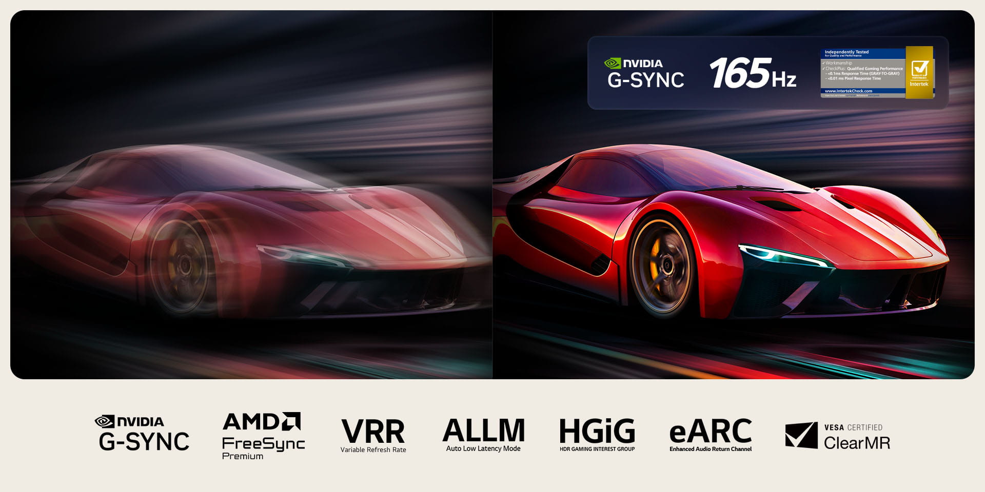 Experience peak gaming with G-Sync compatibility, 165Hz VRR, Intertek-certified 0.1ms response time, AMD FreeSync Premium, and ClearMR 10000 certification. Get your game on without lag or motion blur.