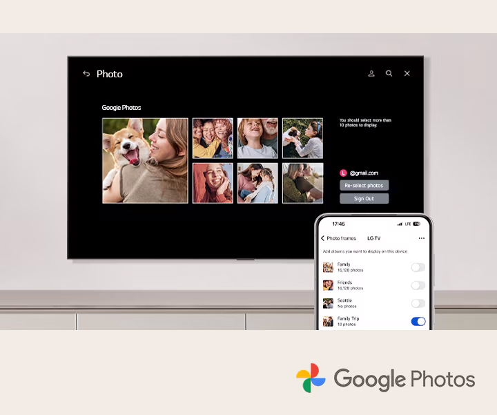 Conveniently connect your Google Photos account to your TV just by using your phone. Effortlessly personalize your space by using content from your own photo library.